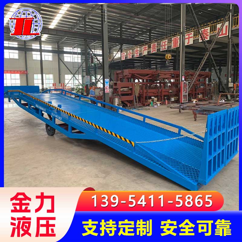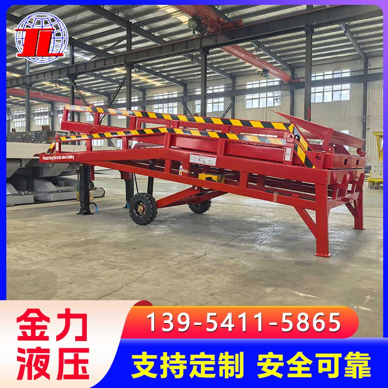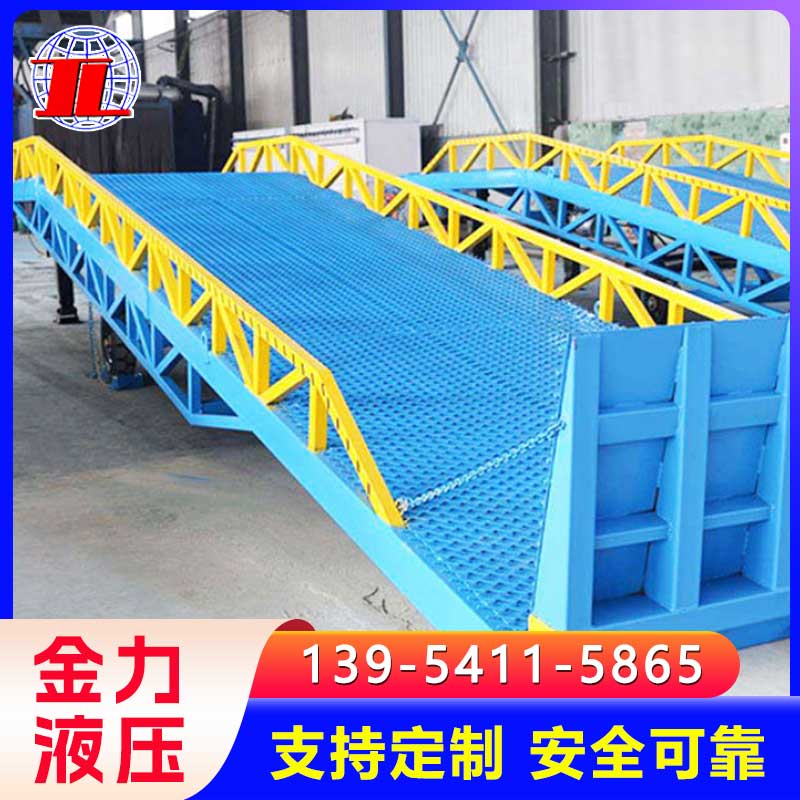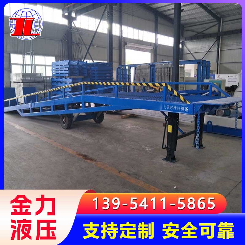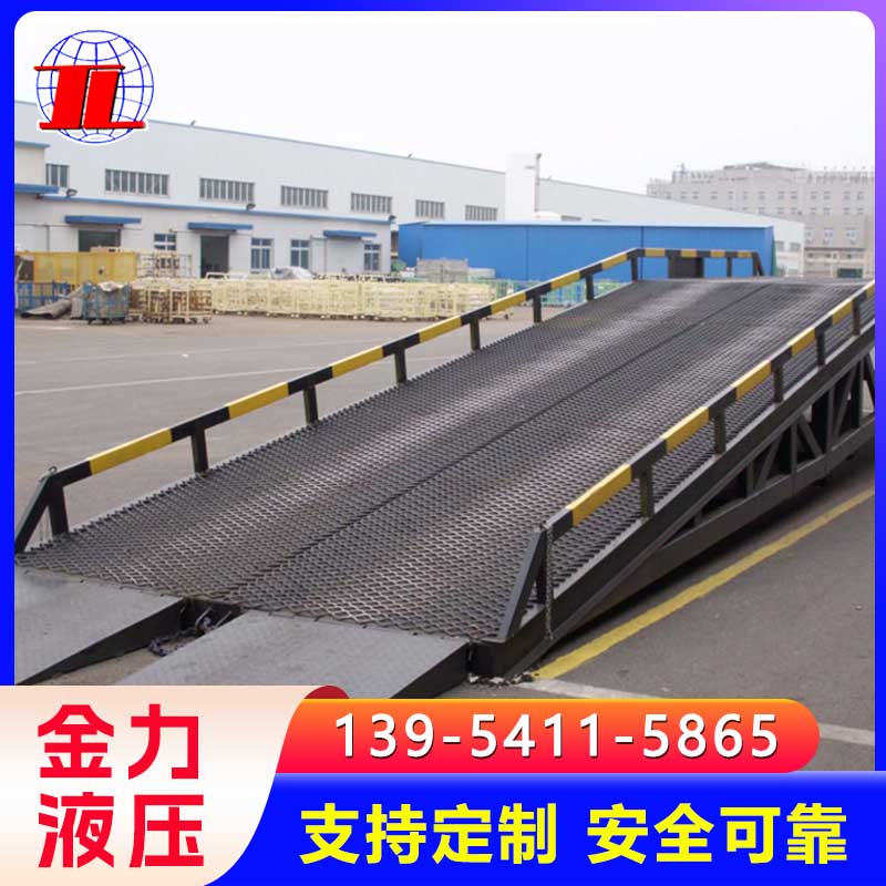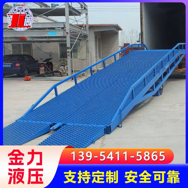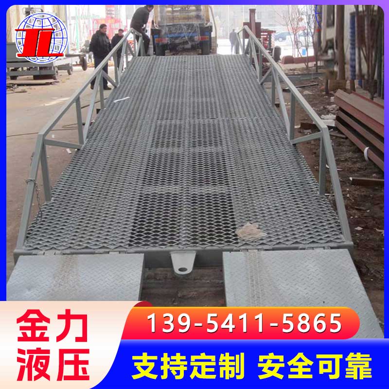 移动式登车桥广泛用于无装卸设备的货台及流动装卸场所,是与叉车配合使用的货物装卸辅助设备。借助移动式登车桥,叉车能直接驶入汽车集装箱内部进行批量装卸作业。只需单人操作,不需动力电源,即可实现货物的安全快速装卸